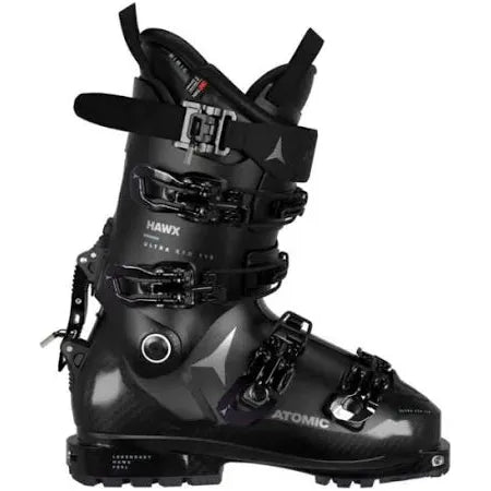 Meet the Atomic Hawx Ultra XTD 115 W CT GW. All-mountain skiing and freeride touring with one boot. Combining the comfort and skiing power of Hawx Ultra with the epic natural movement of Backland and a women-specific cuff shape, this boot accommodates narrower feet. Prolite construction has reinforcement in critical places for stiffness and support. Touring-specific features like Free/Lock 2.0 and Frictionless Pivot help keep movement natural for easier ascending. Complete Tech inserts in both the toe and the heel allow for maximum touring binding compatibility. The highly customizable Mimic Platinum W liner exactly matches your foot shape, with an Achilles Flex Zone for more comfort. GripWalk soles offer more traction without losing performance on the snow. Go earn some turns.